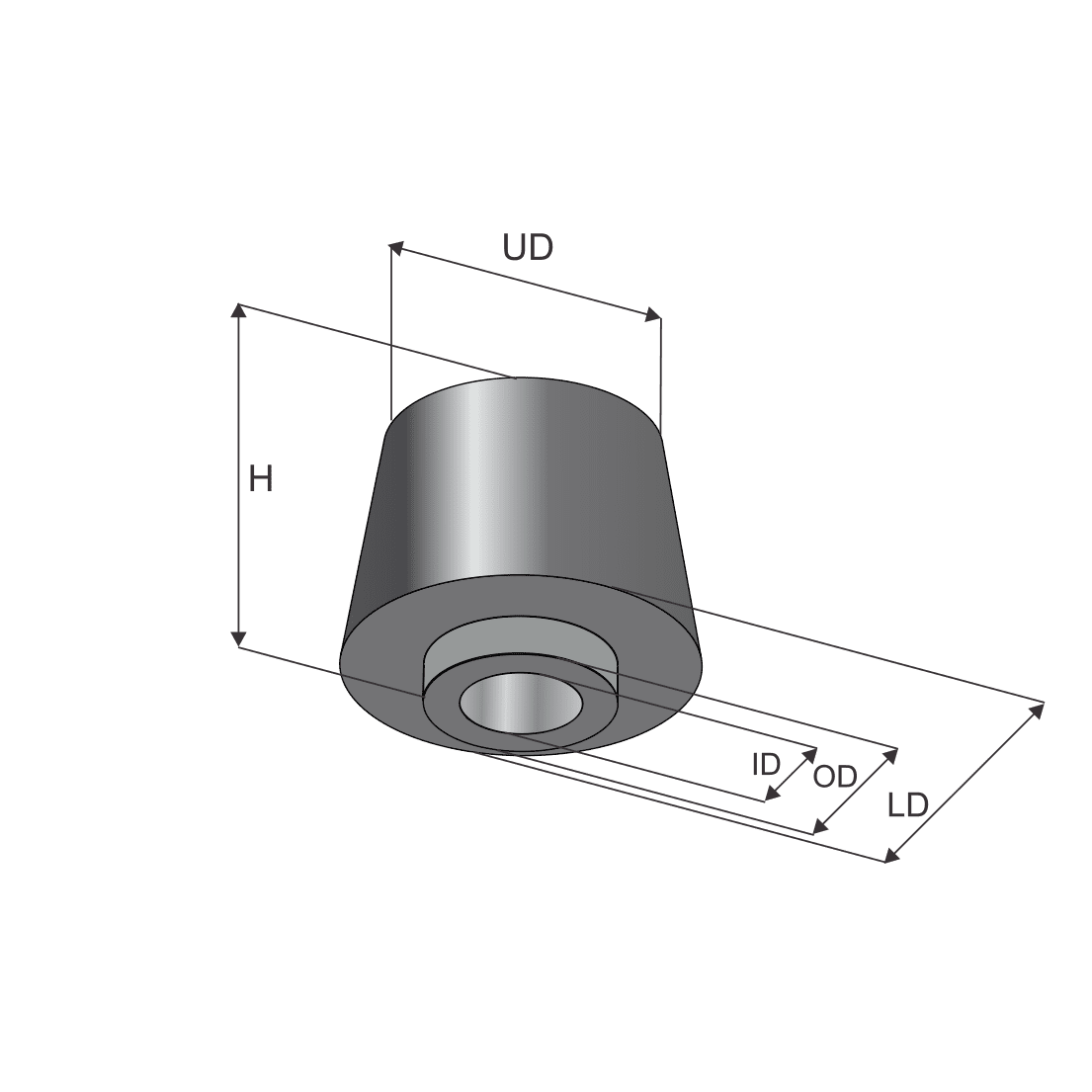 | PART NO. | DUROMETER | RATED LOAD [kg] | DEFLECTION [mm] | ‘LD’ [mm] | ‘UD’ [mm] | ‘H’ [mm] | ‘ID’ [mm] | ‘OD’ [mm] | MAX ROD DIA |